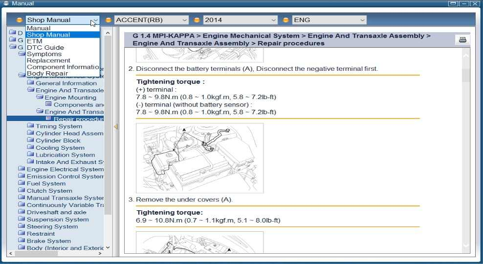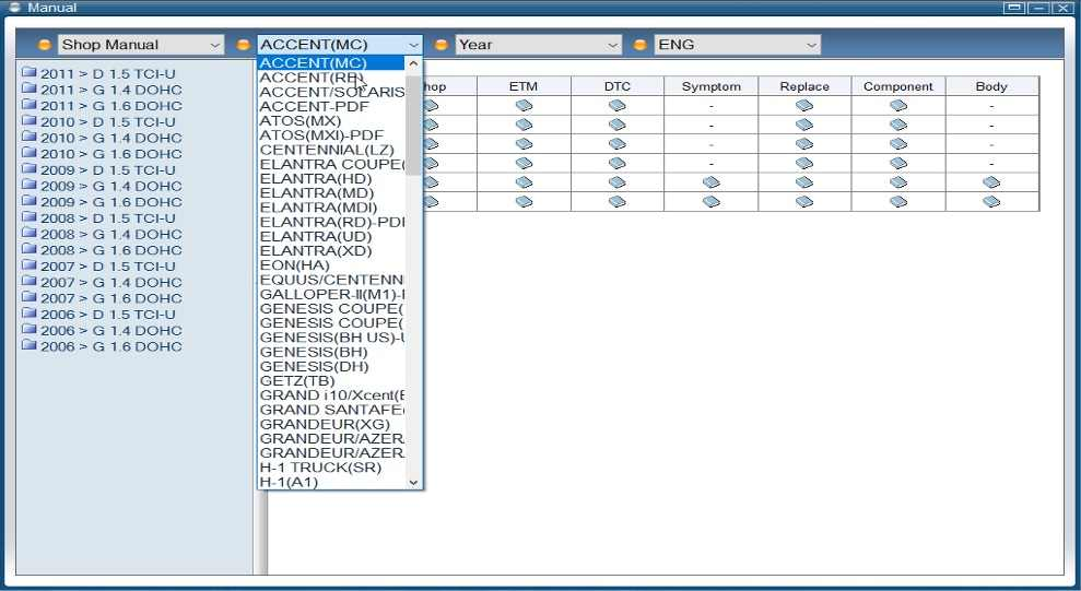 In this section, you can find the different service manuals available for Hyundai vehicles. Depending on the chosen car model, the various engines included in these cars will appear. It includes general information, mechanical system, electronic part, emission system, clutch, transmission, among other aspects.