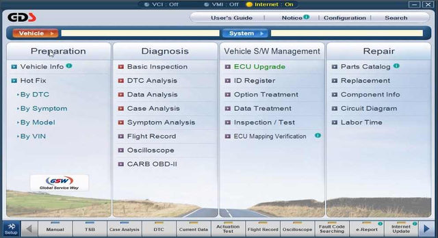Additionally, you can also find information on diesel and gasoline systems. Once the program is installed on your computer and you open it, the main screen will display sections on how to solve problems using DTC codes, symptoms, and specific models. Other available sections include "diagnosis," "vehicle," and "repair."