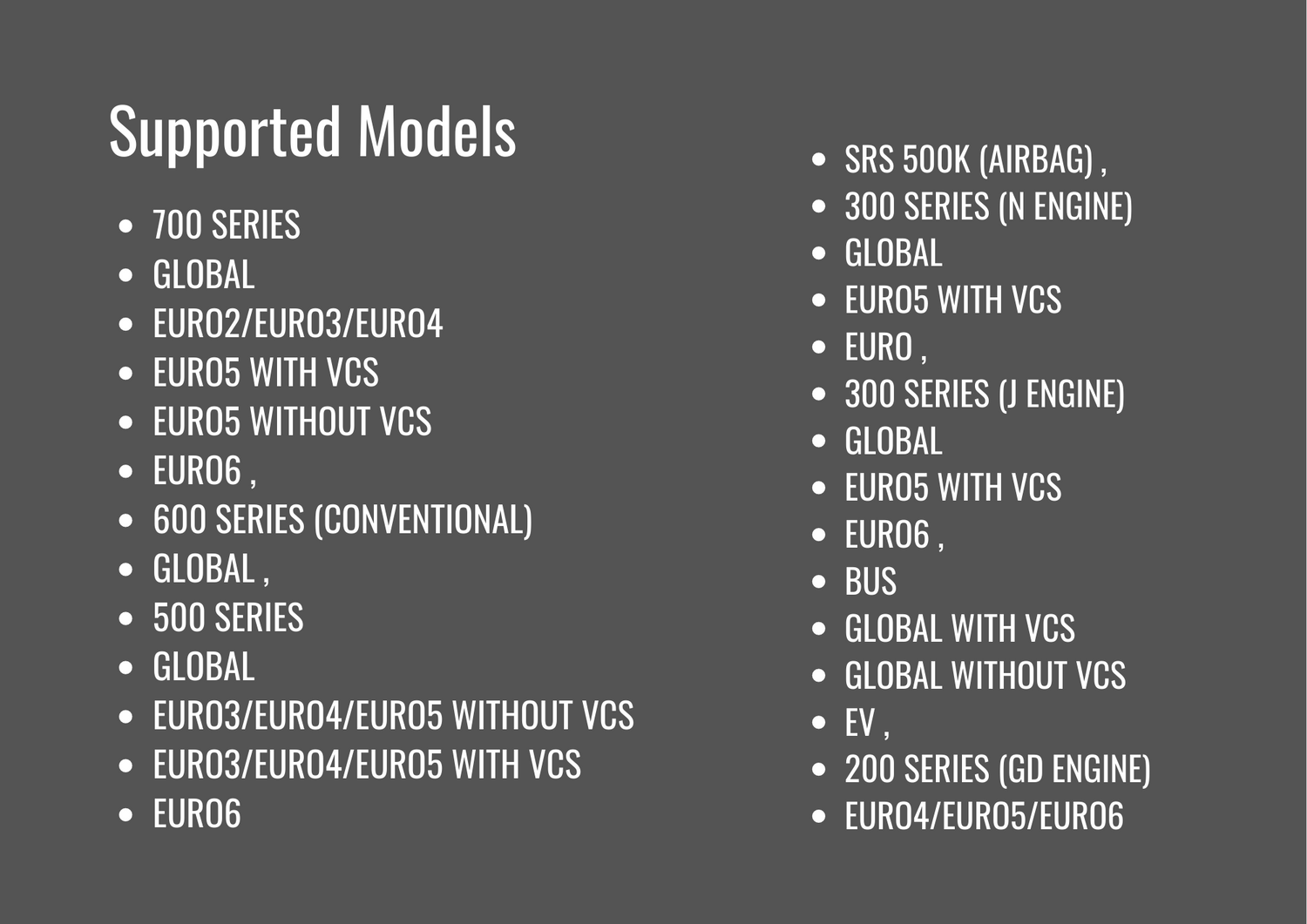 The software is compatible with a wide range of Hino models, such as the 700 series, GLOBAL, EURO2/EURO3/EURO4, EURO5 WITH VCS, EURO5 WITHOUT VCS, EURO6, and the 600 series (conventional), among others.